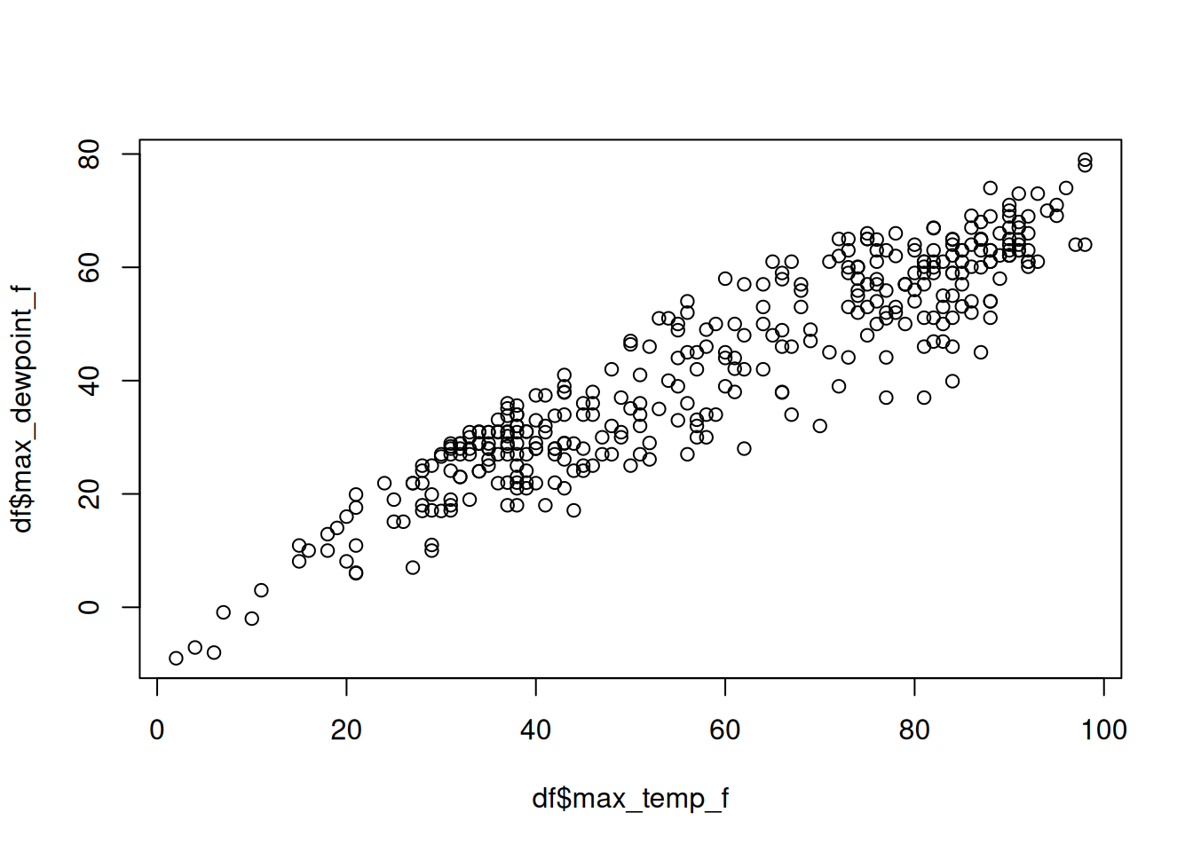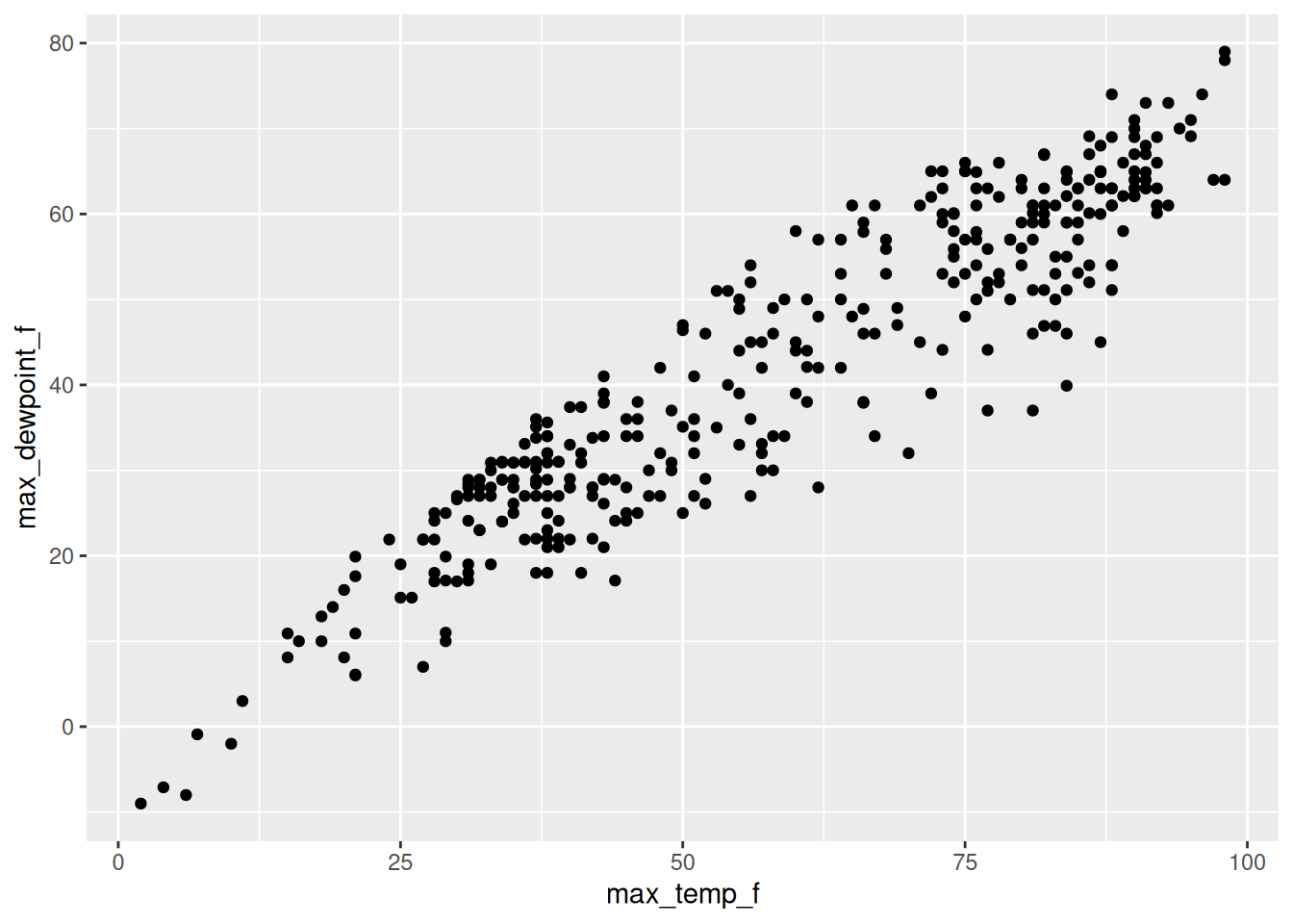 plot(df$max_temp_f, df$max_dewpoint_f)While there can be benefits to loading as few additional packages as possible (fewer parts means fewer things to break as code changes occur into the future), most folks using R these days rely on the tidyverse set of packages for data analysis. Figure 3.2 displays a more idiomatic tidyverse way to load the data and make a simple scatterplot.