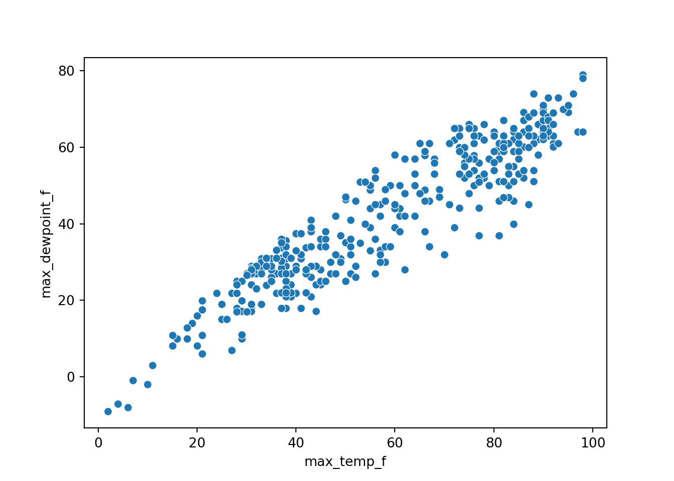 sns.scatterplot(data=df, x="max_temp_f", y="max_dewpoint_f")Finally, Julia is a very promising language with a user base growing in biology (Roesch et al. 2023). It may be a good choice if you have computational needs that would benefit from a language that brings together usability and speed. Julia puts together the convenience of a intentionally designed scripting language with powerful conceptual tools built in (advanced features like powerful macros and metaprogramming abilities) with the execution speed of a compiled language. We believe there is longevity in this purpose-built data science language, although it currently has a smaller user community in the environmental sciences. Notice how the Julia code to produce this plot (Figure 3.4) is very similar to the previous examples, albeit with different functions to produce the plot.