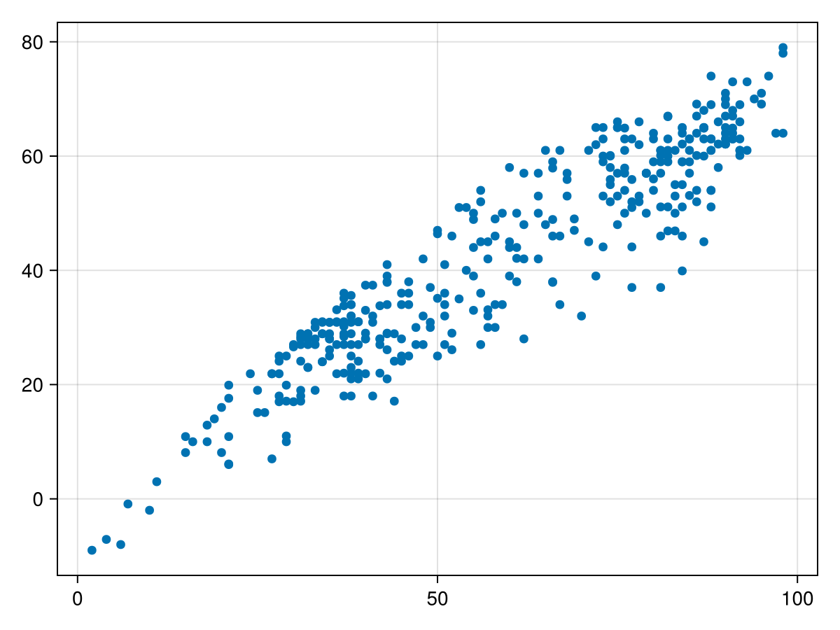 scatter(df.max_temp_f, df.max_dewpoint_f)A commercial alternative to the languages mentioned above is MATLAB. This powerful software is widely used in engineering and industrial applications. However, because it is a commercial and proprietary language, it is not as translatable for open science applications. Many academic institutions have licenses, but if you are not part of an organization that already makes use of it, the cost can be prohibitive. Octave is an open-source analogue to MATLAB, but perhaps doesn’t have as large of a user base in the environmental sciences.